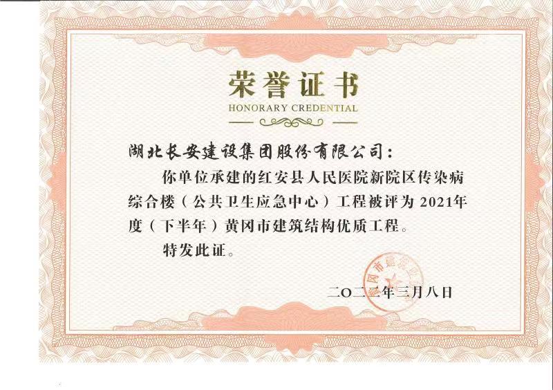 紅安縣人民醫(yī)院新院區(qū)項(xiàng)目被評(píng)為2021年度黃岡市建筑結(jié)構(gòu)優(yōu)質(zhì)工程
